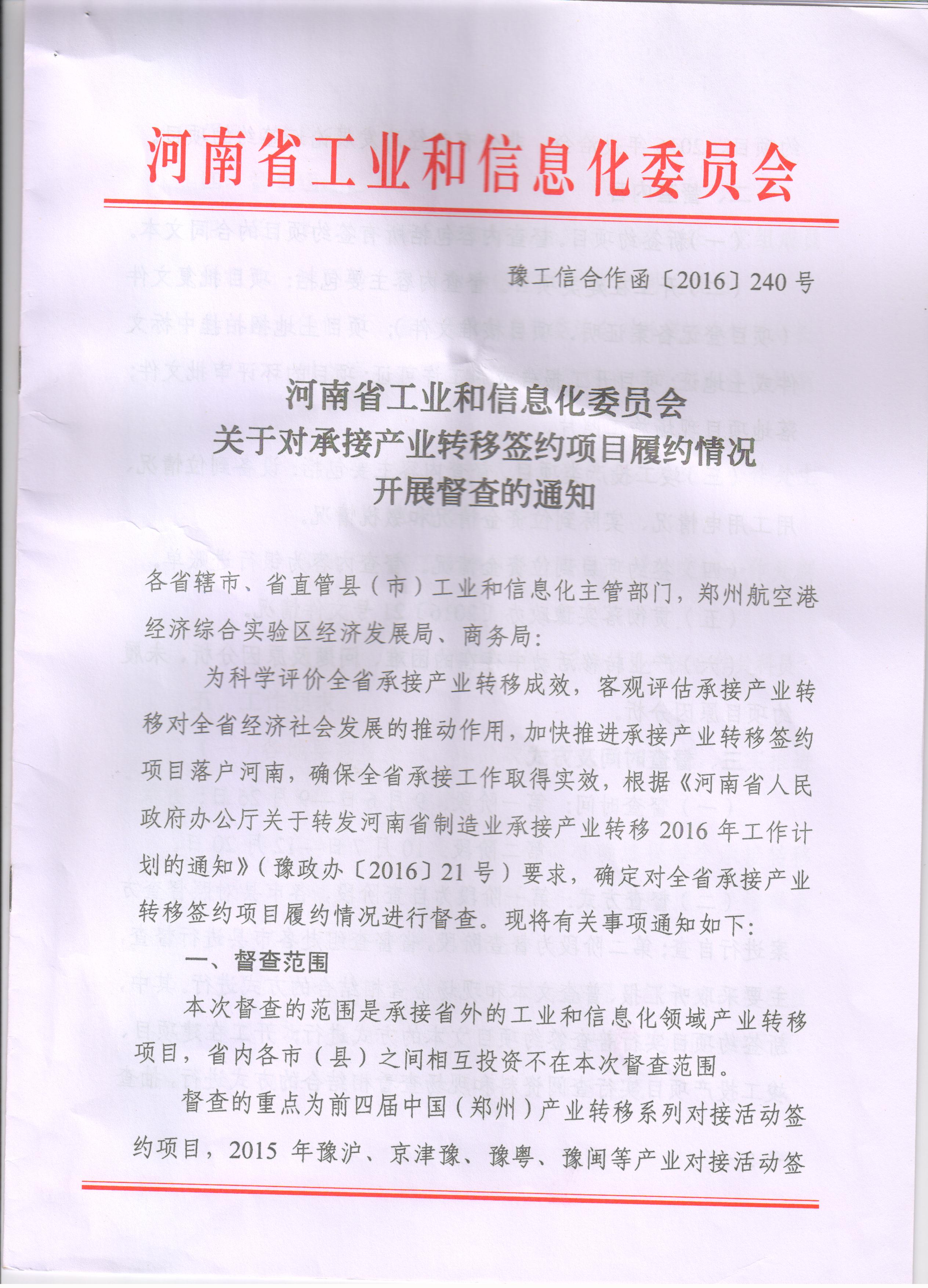 现将河南省工业和信息化委员会《关于对承接产业转移签约项目履约情况开展督查的通知》(豫工信合作函【2016】240号)转发给你们,望各有关单位积极配合,认真落实。