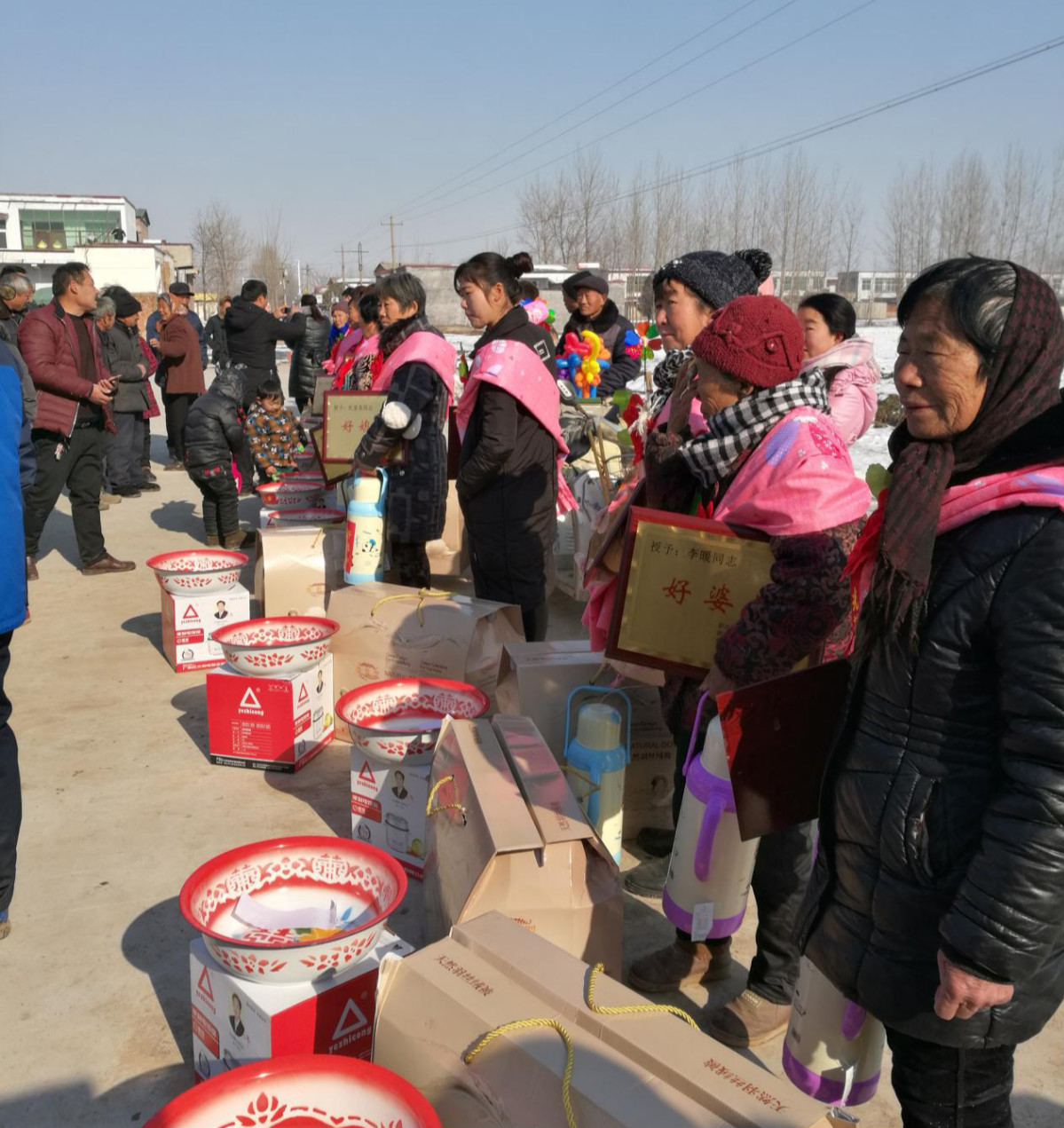 第一个环节是“好婆婆、好媳妇”表彰大会,会议由驻村第一书记张兴龙主持,村委会主任朱百胜宣布表彰人员名单,共十二名人员。县妇联主席尚永红发表讲话,一是对获奖人员表示祝贺,祝贺她们的努力得到了大家的肯定。二是对全村妇女提一个要求,鼓励她们学习模范,争做先进,关爱家庭、团结邻里,为建成和谐的小朱庄共同努力。舒庄乡乡长胡德华发表讲话,一是对获奖者表示祝贺,祝贺她们为全乡的精神文明建设带个好头,二是感谢市工信委为小朱庄做出的巨大贡献,三是要求村委会配合市工信委驻村工作队,做好扶贫工作,带领小朱庄村民共同致富,不负全村1500余乡亲的期望。市工信委副主任冯东民发表重要讲话,一是对“好婆婆、好媳妇”表示祝贺,二是感谢舒庄乡党委政府和小朱庄村委对工作队的支持,三是要求新的驻村工作队继续扎根基层,服务群众,带领全村群众脱贫致富,过上小康生活。然后,出席会议的领导为十二位获奖者颁发奖牌,送上礼品,并合影留念。此次表彰大会起了很好的宣传带动作用,在小朱庄形成了一种良好的风气,人人学模范,各个争先进,全村的精神文明建设向前迈了一大步。